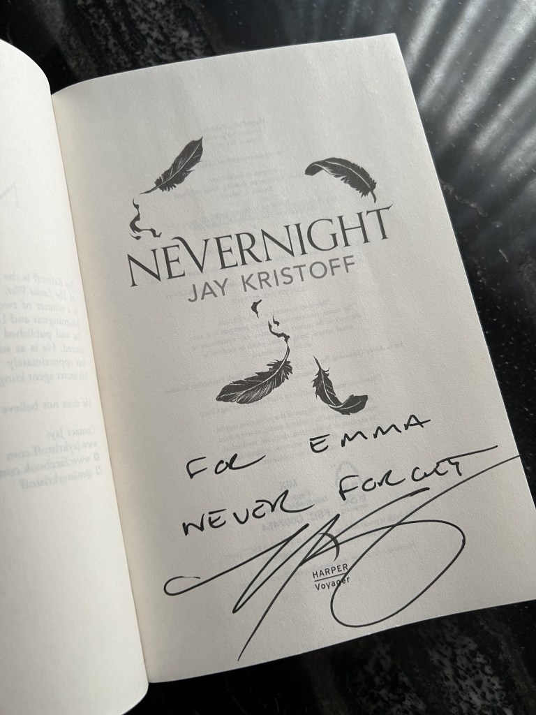 Signed interior page of Nevernight by Jay Kristoff. © E Gill
